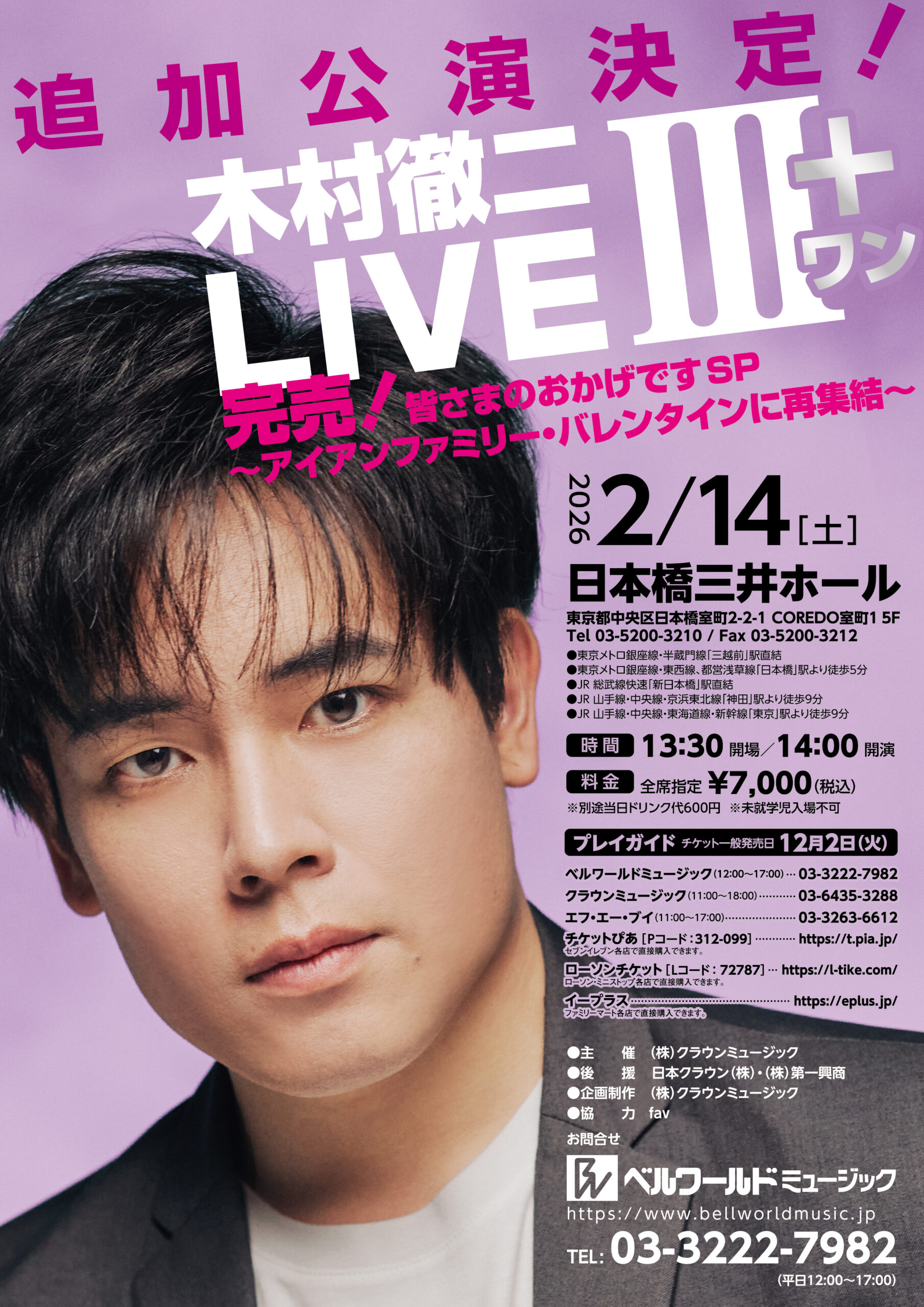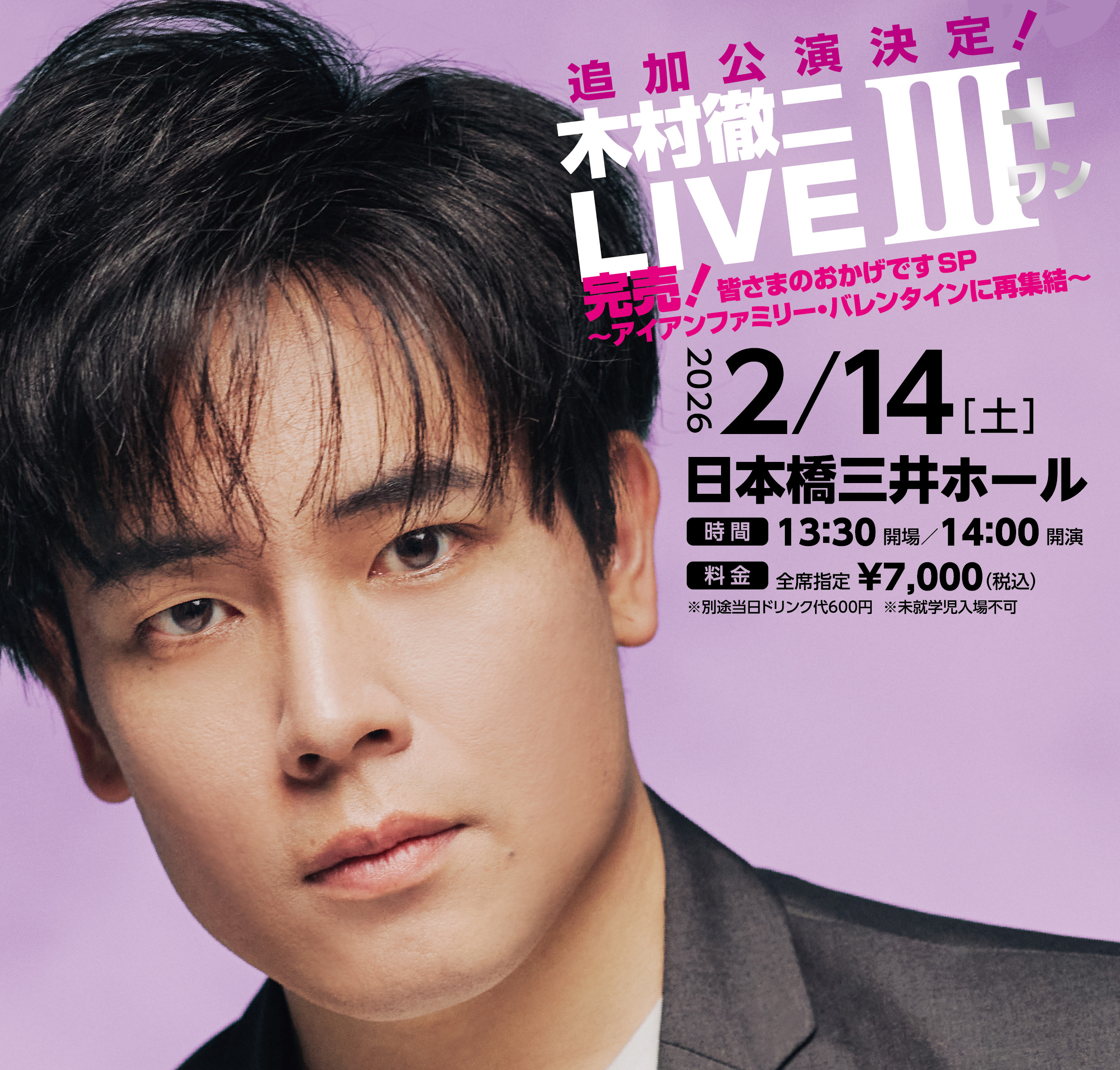 木村徹二 LIVEⅢ+1 fav event 2025.12.30 ※追加公演!・日時 2026年2月14日土曜 13:30開場 14:00開演・会場 日本橋三井ホール 東京都中央区日本橋室町2-2-1 COREDO室町1 5F・チケット 7,000円(当日別途ドリンク代600円必要) チケット絶賛発売中! fav 03-3263-6612(平日11~17:00) ※年始は1月5日より受付