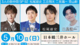 若手人気スター歌謡ショー2026・初夏 fav event 2026.03.06 ・5月9日(土)・日本橋三井ホール(東京都中央区日本橋室町2-2-1 COREDO室町1 5F)・時間 第一部:12:00開場/12:30開演 第二部:15:30開場/16:00開演・料金 一般:7,500円 学生:3,000円・出演 松原健之 パク・ジュニョン 原田波人 風輪 楠木康平※(1ドリンク別途600円当日支払) fav友の会先行受付 3月6日金曜11時〜3月20日金曜17時 fav友の会先行受付